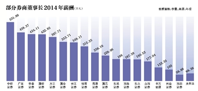 就券商董事長(zhǎng)薪酬來(lái)看,2014年薪酬超過(guò)400萬(wàn)的包括中信證券董事長(zhǎng)王東明,薪酬為531萬(wàn)元;廣發(fā)證券董事長(zhǎng)孫樹明438萬(wàn)元;華泰證券董事長(zhǎng)吳萬(wàn)善424萬(wàn)元;國(guó)信證券董事長(zhǎng)何如423萬(wàn)元。