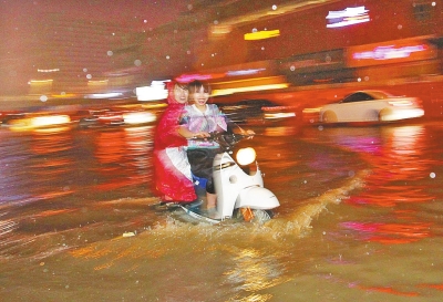 昨晚11時(shí)30分許,經(jīng)三路上兩個(gè)女孩騎著電動(dòng)車(chē)走在“汪洋”中。