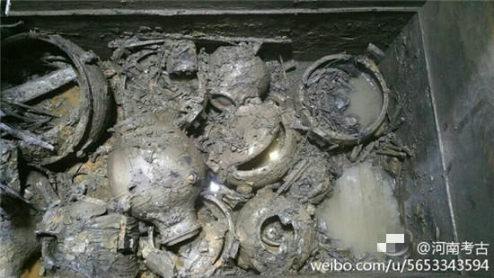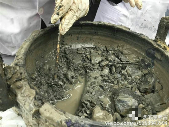 據(jù)@河南考古 微博消息,近日在河南一座古墓發(fā)掘現(xiàn)場(chǎng),出土了幾只裝有“肉湯”大鼎,。