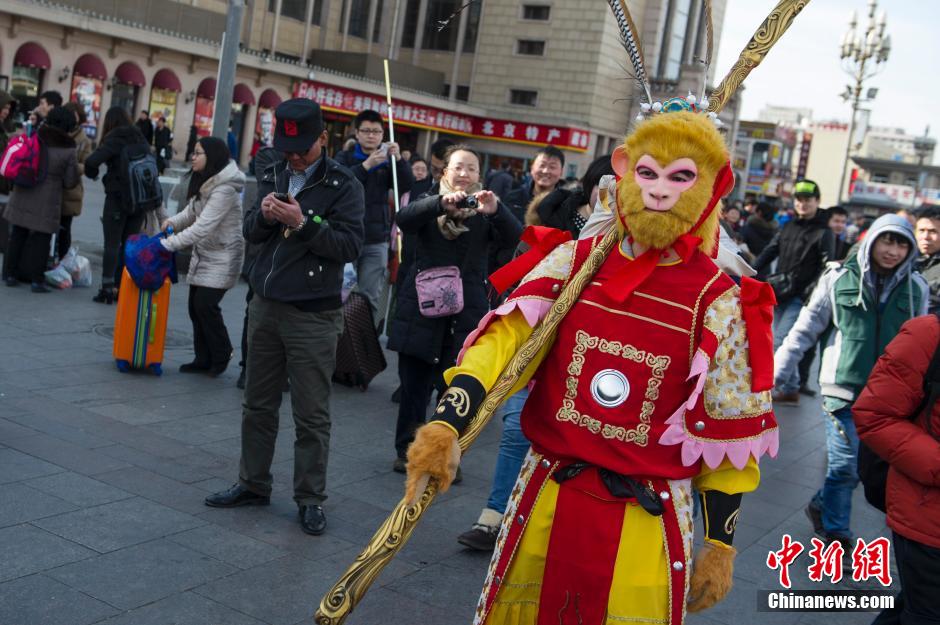 1月25日,孫悟空扮相的演員正在排隊買票。當日,一名孫悟空扮相的旅客“快閃”現(xiàn)身北京站,引發(fā)周圍旅客和民眾圍觀。據(jù)了解,孫悟空的扮演者是一名來自北京電影學院的河南籍學生,由于自己很快也將成為2014春運大軍中的一員,他表示希望用孫悟空勇敢機智的形象,以“快閃”的形式為旅途中的人們加油打氣,他同時也希望自己在新的一年里能有一番作為。中新社發(fā) 崔楠 攝