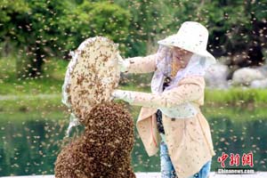 穿上防蜂服的工作人員從阮良明頭部緩緩倒下大量蜜蜂,沒過多久,阮良明整個(gè)頭部布滿密密麻麻的蜜蜂。 鄒海斌 攝