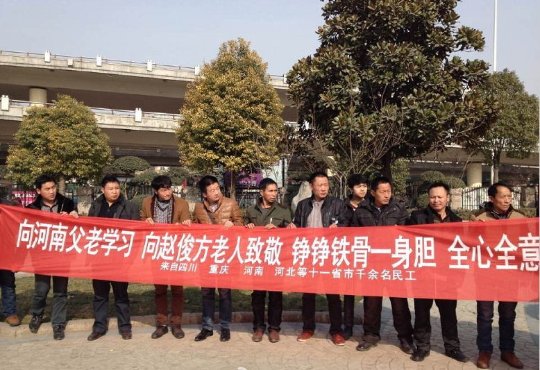 去年11月,濮陽老人趙俊方(2010年“感動中國”候選人)遠赴山東聊城陽谷,幫13省1000余農(nóng)民工討薪,經(jīng)過近兩個月努力,要回280萬。為表感謝,1月17日,來自6個省份的農(nóng)民工兄弟齊聚鄭州,為老人送來錦旗。