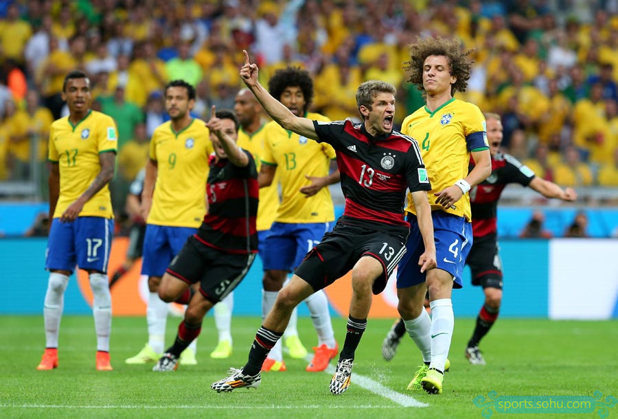 北京時(shí)間7月9日凌晨4時(shí),2014年巴西世界杯首場半決賽在貝洛奧里藏特的米內(nèi)郎體育場進(jìn)行,東道主巴西迎戰(zhàn)上屆季軍德國。最終,德國隊(duì)?wèi){借在18分鐘內(nèi)連入5球的攻擊狂潮以及下半場許爾勒替補(bǔ)登場后的梅開二度,7-1超大比分淘汰巴西,昂首晉級(jí)決賽。第10分鐘,穆勒利用角球機(jī)會(huì)首開紀(jì)錄。第22分鐘,克洛澤門前兩連擊攻入世界杯第16球,超越羅納爾多,成為世界杯進(jìn)球第一人。第24分鐘和第25分鐘,克羅斯1分鐘內(nèi)連入2球。第28分鐘,赫迪拉又接厄齊爾傳球打進(jìn)一球。第68分鐘,許爾勒又接拉姆助攻,門前包抄打門得手。第79分鐘,許爾勒禁區(qū)左側(cè)小角度攻入世界波。第90分鐘,奧斯卡才攻入挽回顏面的一球。
