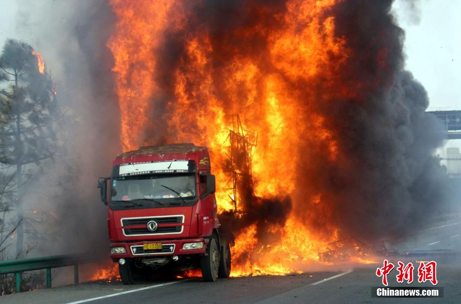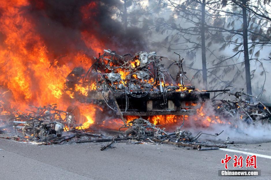 1月23日下午16時(shí)許,滬昆高速公路江西弋陽往貴溪方向593公樁(貴溪收費(fèi)站附近)一輛載有133部電動車的半掛車起火,導(dǎo)致電動車被大火“吞噬”。江西貴溪消防官兵接警后迅速到場撲救,半小時(shí)后將大火撲滅。據(jù)司機(jī)稱,火災(zāi)疑因高速護(hù)坡雜草叢起火產(chǎn)生的火芯飄至半掛車,引燃包裝電動車的紙殼箱所致。中新社發(fā) 龔武 攝