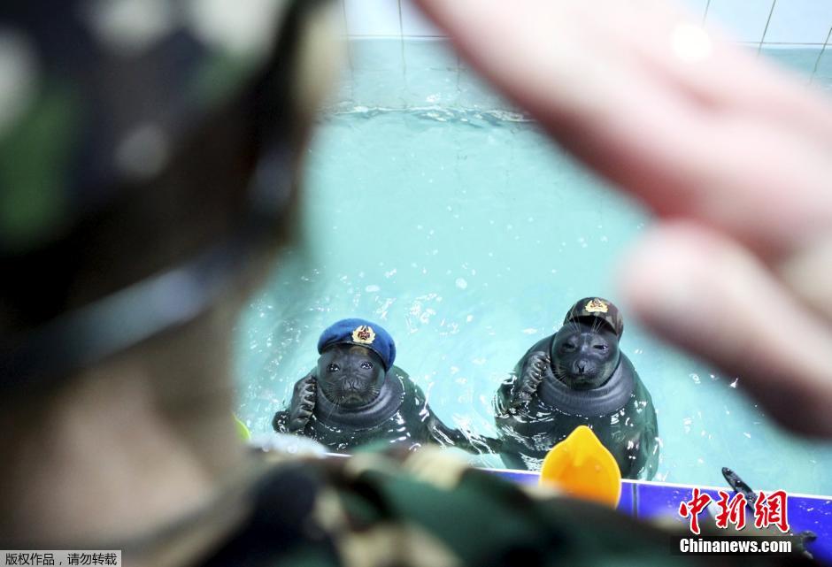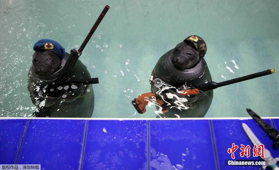 當(dāng)?shù)貢r(shí)間5月9日,莫斯科紅場(chǎng)舉行盛大閱兵式慶祝衛(wèi)國(guó)戰(zhàn)爭(zhēng)勝利70周年。在俄羅斯的伊爾庫茨克水上公園里,海豹們也身著“軍裝”認(rèn)真的在水中列隊(duì)接受訓(xùn)練員的檢閱。