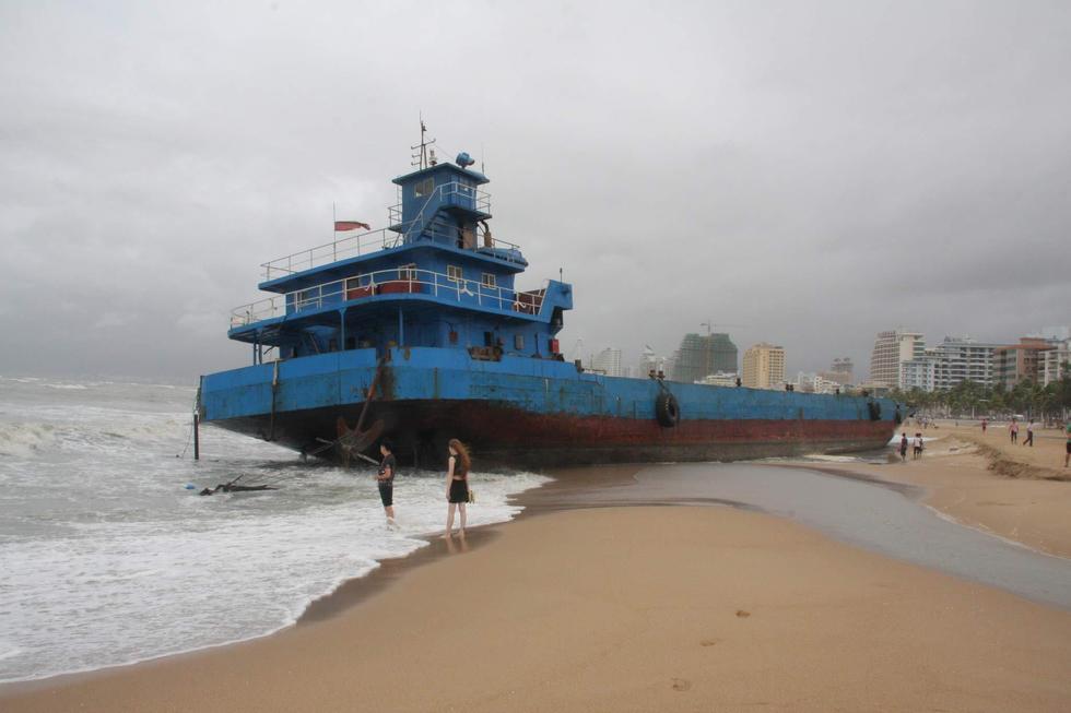 2015年6月23日,海南三亞,“鯨魚”臺風襲擊海南省萬寧市,三亞海面大風大浪,2艘大型貨輪和一艘旅游船,被刮到了三亞灣沙灘上。
