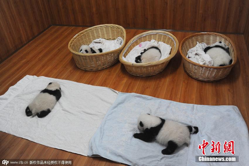 酣睡中的熊貓寶寶們。2015年大熊貓產(chǎn)仔形勢喜人,特別是大熊貓雙胞胎數(shù)量,已經(jīng)達到7對,是研究中心有記錄以來雙胞胎數(shù)量最多的一年。 圖片來源:CFP視覺中國