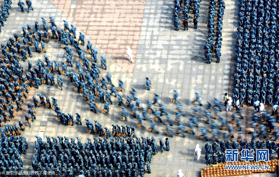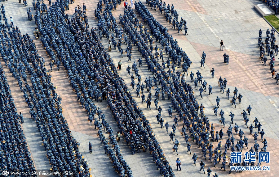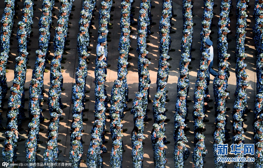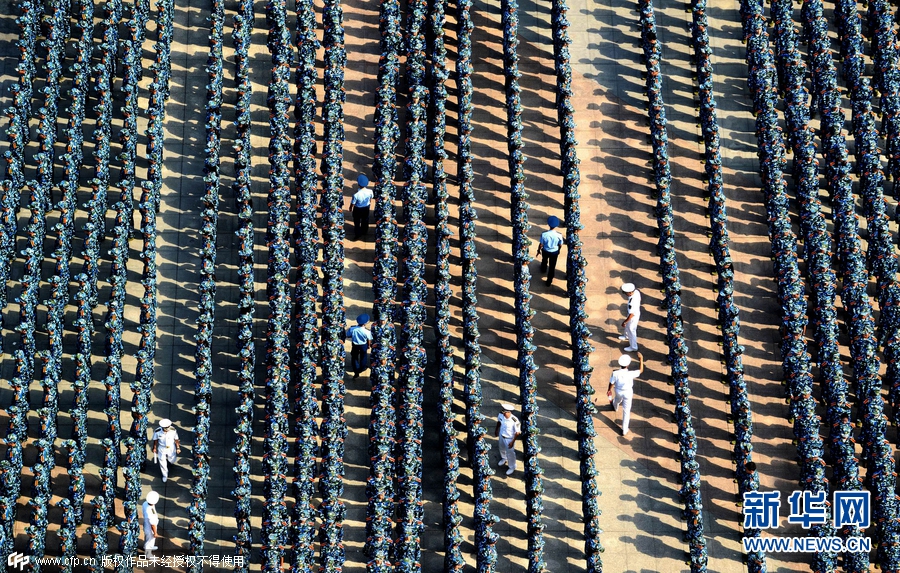 2015年9月14日,湖北武漢,當(dāng)日上午,武漢理工大學(xué)2015級(jí)本科生開(kāi)學(xué)典禮暨軍訓(xùn)動(dòng)員大會(huì)在該校南湖校區(qū)舉行,全校多個(gè)校區(qū)約9000名新生身著迷彩戎裝一起進(jìn)行軍訓(xùn),場(chǎng)面震撼壯觀。南湖校區(qū)現(xiàn)場(chǎng)集合了約7000名新生參與軍訓(xùn),隊(duì)列整齊、英姿颯爽,熱情投入軍訓(xùn),開(kāi)啟了朝氣蓬勃的大學(xué)新生活。圖片來(lái)源:cfp