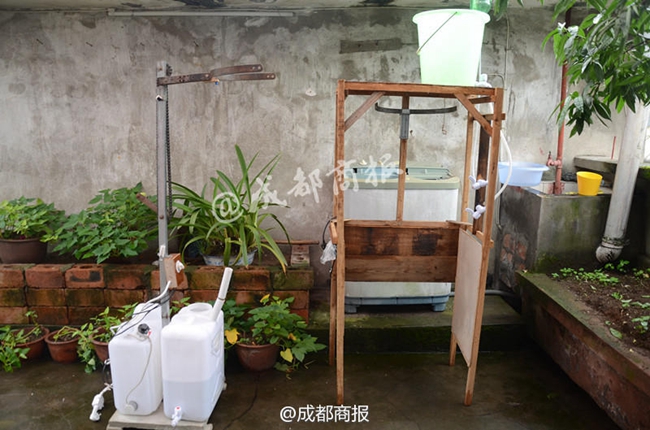 洗頭機系一個鐵架子頂部掛著摩托車頭盔,旁邊擺著兩個塑料水箱,還有一塊控制面板……陳攻科的父親陳述明帶上防水圍脖,坐在椅子上,輕輕按下一個按鈕,摩托車頭盔自動下降罩在他頭上,他再次按下按鈕,摩托車頭盔便在他頭上擺動按摩起來。