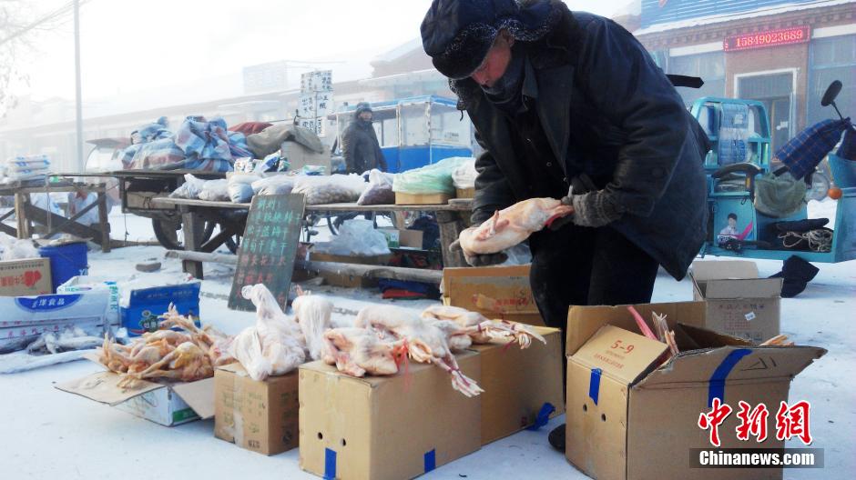 呼倫貝爾市圖里河鎮(zhèn)菜市場(chǎng),當(dāng)日?qǐng)D里河鎮(zhèn)最低氣溫達(dá)-42℃。 圖片來(lái)源:視覺(jué)中國(guó)