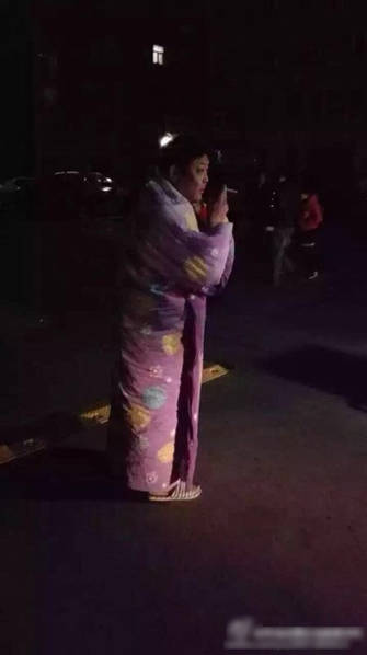有網(wǎng)友反映,其時(shí)當(dāng)?shù)貞敉鉁囟冗_(dá)零下十四度,許多市民出來(lái)避震時(shí)不得不罩著被子。圖為現(xiàn)場(chǎng)災(zāi)民。