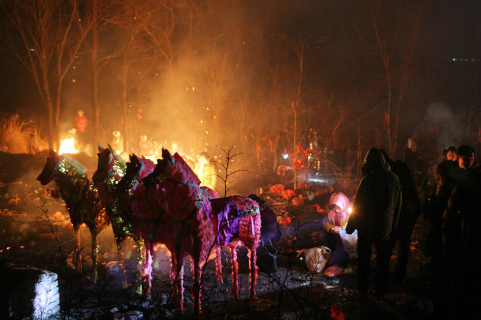 2016年2月23日凌晨,山東省濱州市惠民縣小霹靂莊,宋代古冢牛保冢上一年一度的正月十六祭祀活動(dòng)正式開始,方圓百里萬(wàn)余百姓陸陸續(xù)續(xù)趕來(lái)祭祀,以求風(fēng)調(diào)雨順,家和事興。多種祭祀用紙馬先后被抬上祭壇引燃,化作火龍直沖云天,數(shù)量足有數(shù)千匹之多,場(chǎng)面壯觀且奇異,親臨現(xiàn)場(chǎng)宛若置身神鬼大片,令人印象深刻。