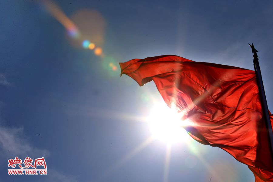 藍天白云下的紅旗飄飄 段晉哲/圖