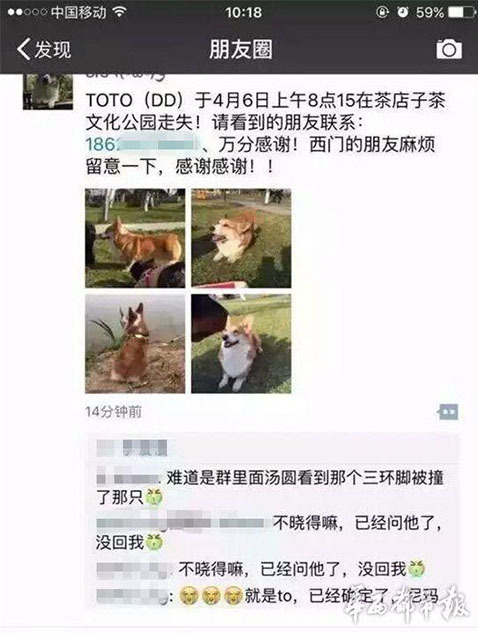 據(jù)主人李女士講述,“早上8點(diǎn)20分左右,我媽媽帶狗出去散步,它跟著別的狗跑丟了。我們找了很久?!崩钆空f(shuō),小狗跑丟后,在成都一愛(ài)寵微信群里,有群友稱在三環(huán)路上看到過(guò)它,“說(shuō)是它橫穿三環(huán)路,把后腿撞到了,它就沿著三環(huán)路跑了?!眻D為李女士在朋友圈發(fā)布的尋狗信息。