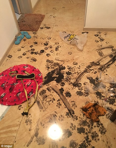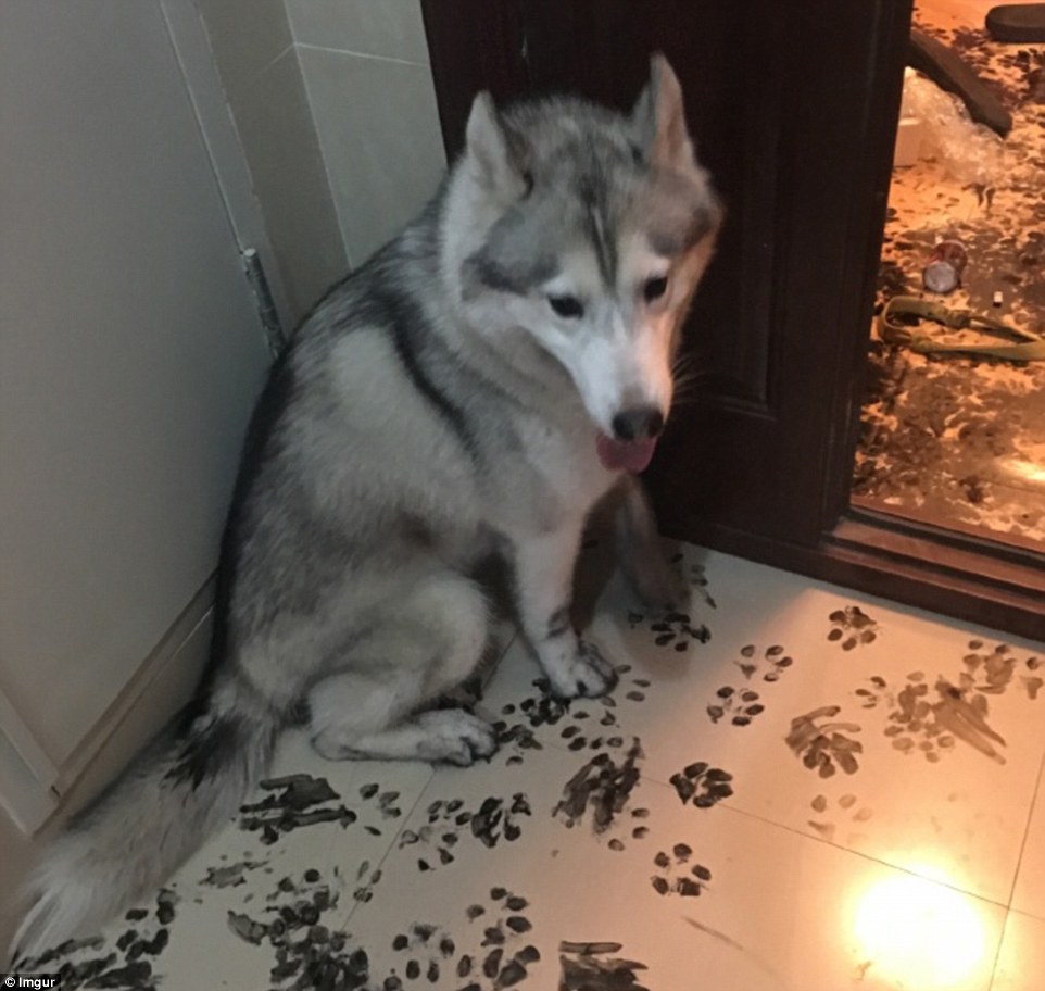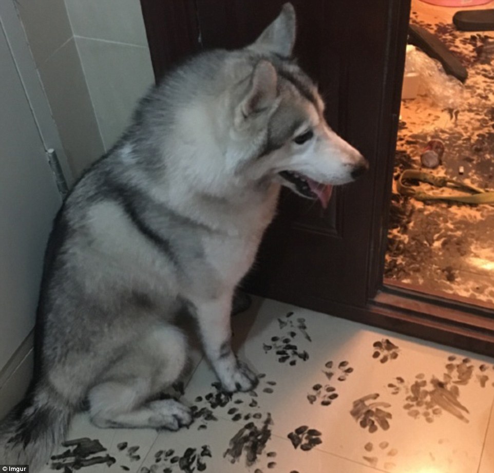 哈士奇或許在書房里翻到了主人練習(xí)書法用的墨汁并不小心打翻了,之后沒心沒肺的二哈踩著墨汁到處轉(zhuǎn)悠,房子的各個角落都留下了二哈烏黑的爪印。