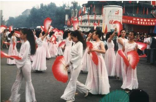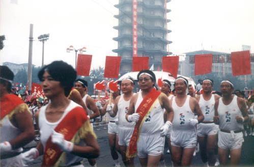 火炬從二七廣場開始傳遞。“李寧”運(yùn)動服、“健力寶”飲料、熊貓“盼盼”成為當(dāng)時的大亮點(diǎn)。(攝影 | 尹人)