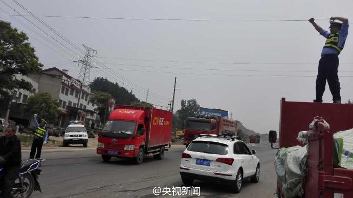 交警董金橋手托線纜。 央視記者 魏軼 圖片來源:央視新聞官方微博