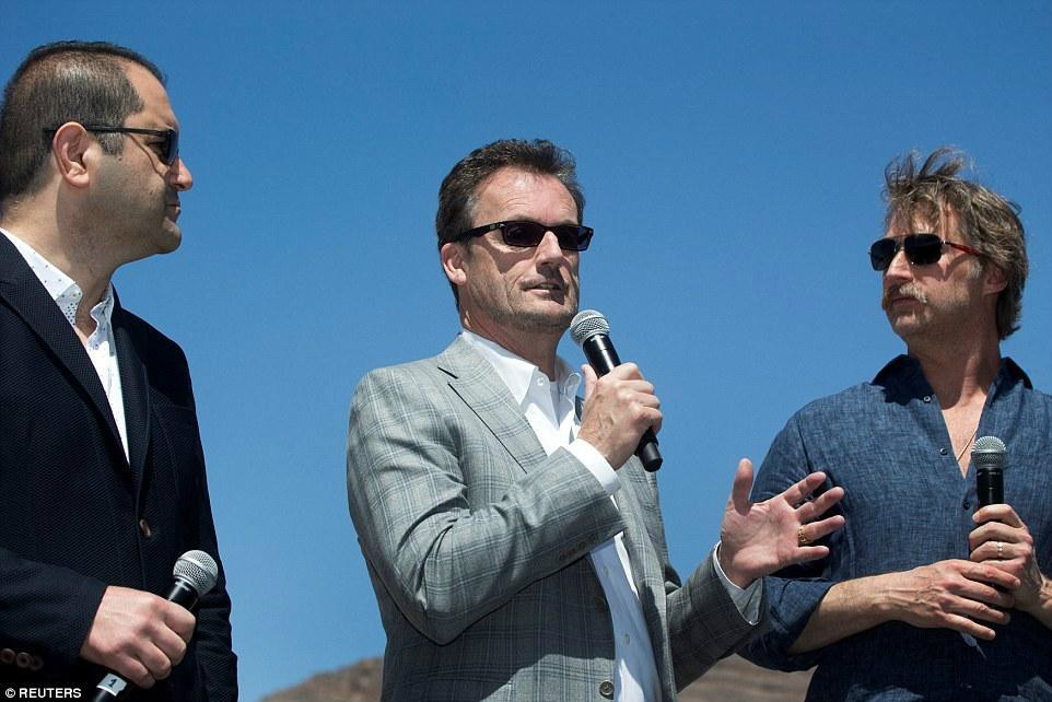 圖中間是Hyperloop One公司CEO羅布-勞埃德,左右兩邊分別是Hyperloop One公司創(chuàng)始人舍文-皮許瓦爾和布羅根-班布羅根。他們在北拉斯維加斯超級(jí)高鐵推進(jìn)系統(tǒng)測試之后發(fā)表了講話。