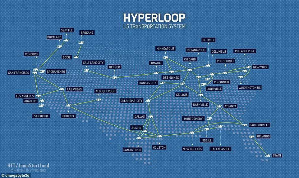 馬斯克在提出超級(jí)高鐵概念時(shí)曾說它是協(xié)和式超音速噴射客機(jī)、軌道炮和空氣球臺(tái)的交叉結(jié)合,圖為HTT公司想架設(shè)超級(jí)高鐵的地區(qū)路線圖。