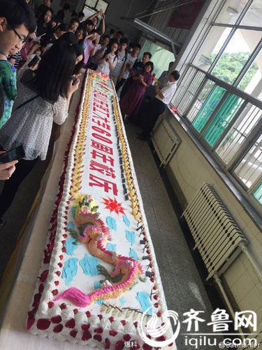 記者從網(wǎng)友發(fā)布的圖片中看到,在山東理工大學(xué)的某個(gè)食堂內(nèi),六米長的水果蛋糕被學(xué)生圍城了一個(gè)圈,而在該食堂的陽臺上站著一位老師,場面也十分歡樂。