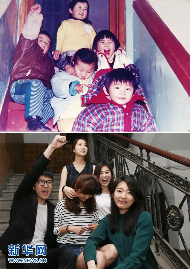 上圖:唐文磊(左一)和幾個小伙伴在上海市北蘇州路附近一幢大樓內(nèi)的樓梯間合影(1992年攝,資料照片);下圖:5月25日,唐文磊(左一)和上圖中的小伙伴在上海市北蘇州路附近一幢大樓內(nèi)的樓梯間合影(新華社記者 丁汀 攝)。新華社發(fā)