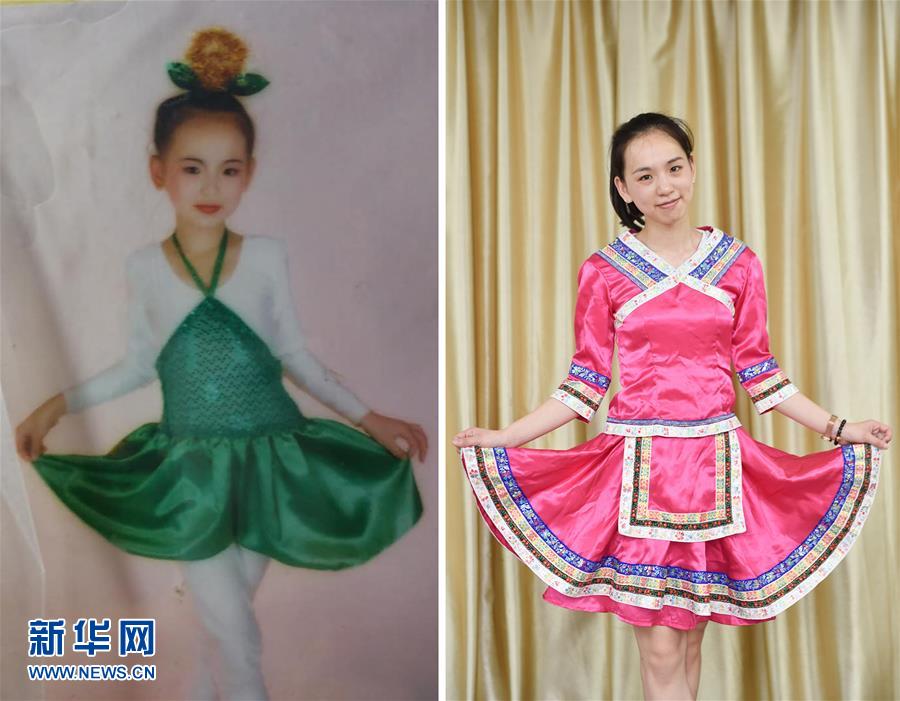 左圖:姜春曉童年時表演節(jié)目(資料照片);右圖:5月27日,福建福州市聾啞學校“90后”音樂老師姜春曉在為學?!傲弧惫?jié)目做準備(新華社記者 宋為偉 攝)。新華社發(fā)