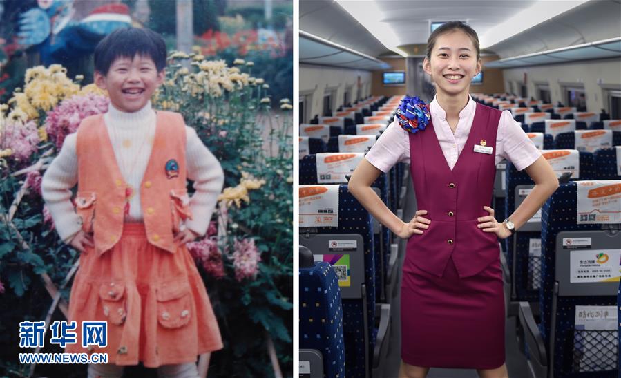 左圖:劉嘉楠6歲時的留影(1998年攝,資料照片);右圖:5月25日,24歲的南昌鐵路局福州客運段動姐劉嘉楠在動車內(nèi)留影(新華社記者 宋為偉 攝)。新華社發(fā)