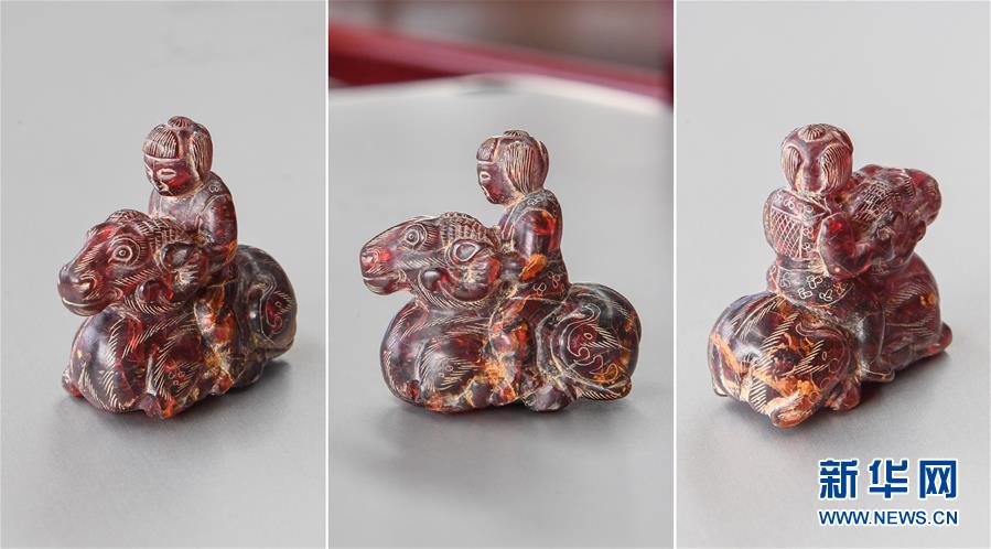 這是河南洛陽市西朱村曹魏大墓出土的琥珀人物騎羊雕刻件(2016年11月8日攝)。新華社記者李賀攝