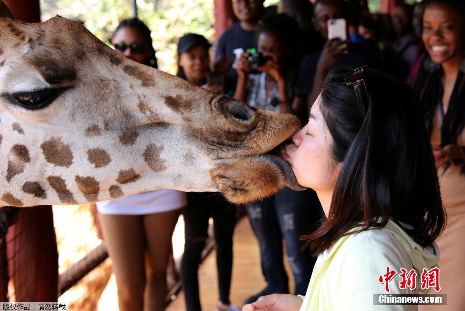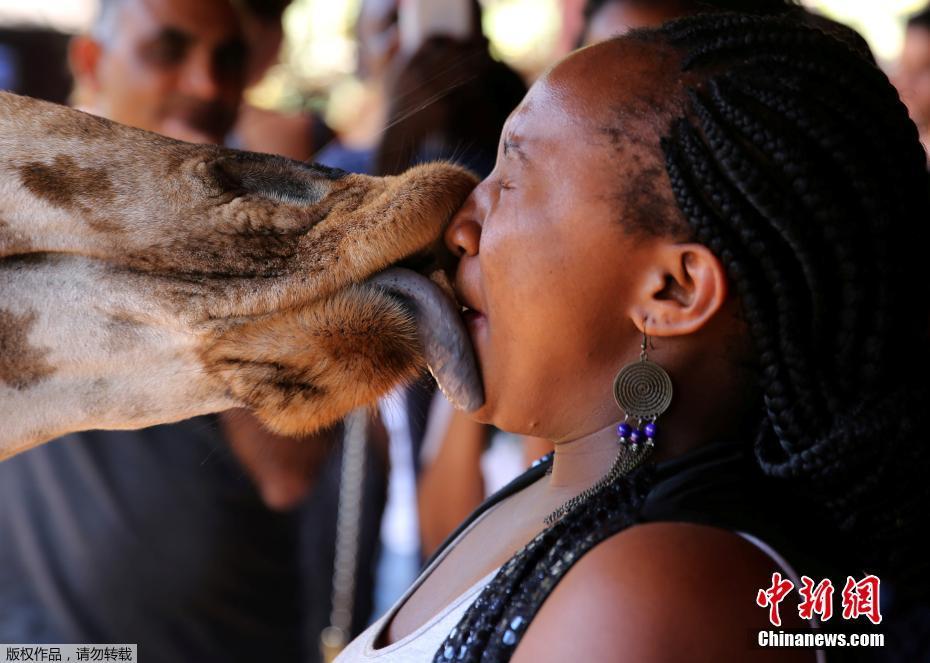 當?shù)貢r間1月15日,肯尼亞內(nèi)羅畢的一個動物園內(nèi),游客用嘴喂食長頸鹿,人與動物親密接觸,其樂融融。