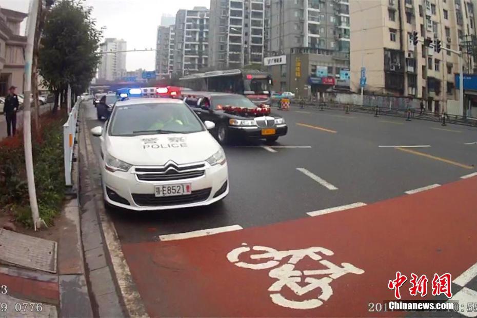 2月22日,湖北宜昌一位新郎在迎親時(shí),迎親車隊(duì)的頭車因涉嫌套牌被交警查獲。在新郎家屬和交警溝通后,當(dāng)?shù)亟痪诵曰瘓?zhí)法,先“開(kāi)道護(hù)送”,迎親結(jié)束后才扣下套牌車。圖為警車“護(hù)送”新人完成儀式。石寧 攝