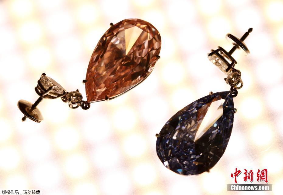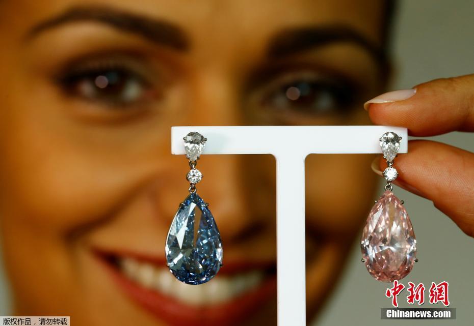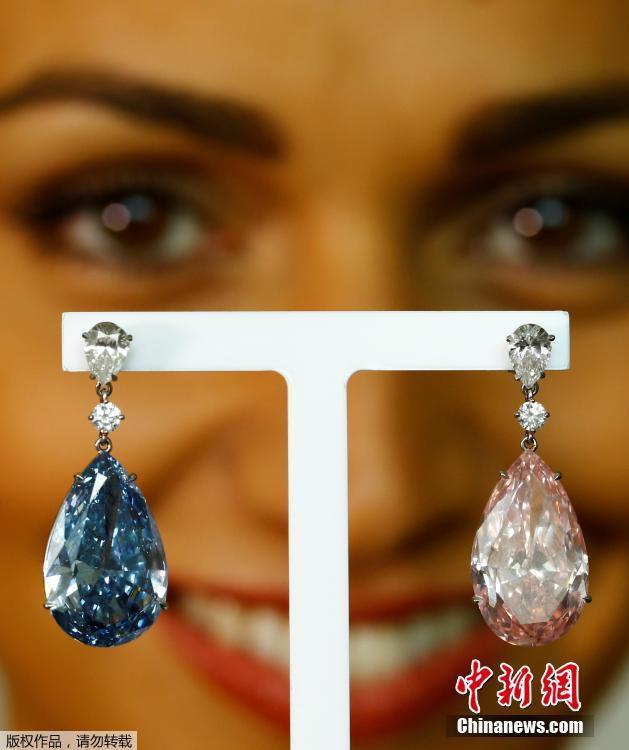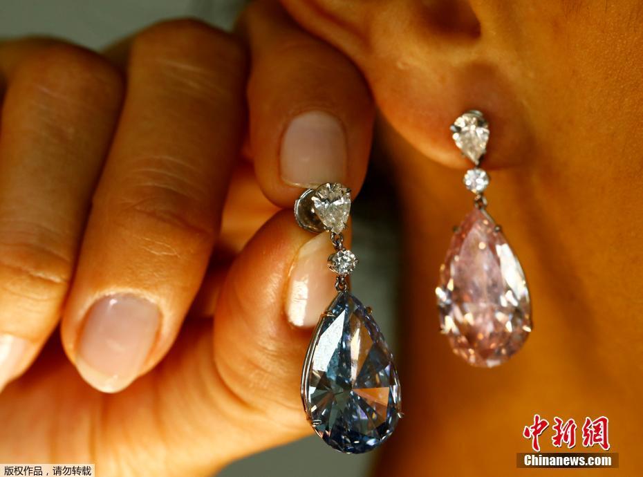 當?shù)貢r間2017年5月11日,瑞士日內(nèi)瓦,14.54克拉的“阿波羅藍”和16克拉的“阿耳特彌斯粉”鉆石耳環(huán)即將在蘇富比拍賣行拍賣,估價分別為3800-5000萬美元和1250-1800萬美元。