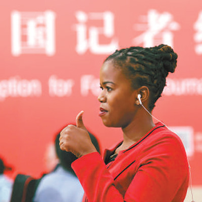 外國記者在十九大新聞中心進行現(xiàn)場連線報道。 本報記者 雷 聲攝