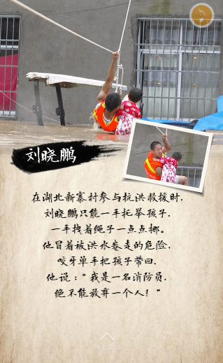 在湖北新寨村參與抗洪救援時,劉曉鵬只能一手托舉孩子,一手拽著繩子一點(diǎn)點(diǎn)挪。他冒著被洪水卷走的危險(xiǎn),咬牙單手把孩子帶回 ,他說:“我是一名消防員,絕不能放棄一個人!”