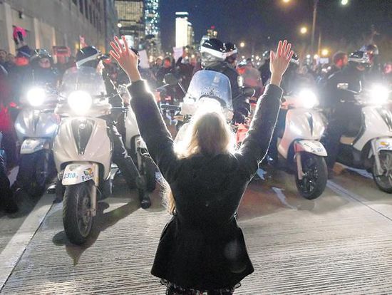 12月3日,美國紐約一個(gè)大陪審團(tuán)投票決定,將不起訴扼死黑人小販的涉事警察。裁決宣布后,紐約市長(zhǎng)呼吁不滿者和平示威,紐約市民則再次走上街頭抗議。