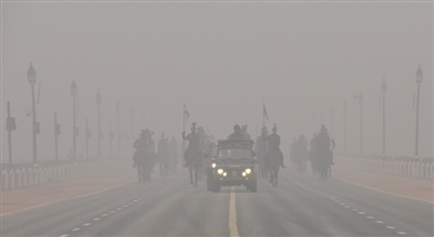 2016年1月7日,印度新德里,印度士兵在霧霾中進行共和日閱兵彩排。印度媒體報道稱,機動車排放是新德里空氣污染的重要原因。自今年1月1日起,新德里實行單雙號限行,交通擁堵情況得到明顯改善。