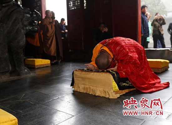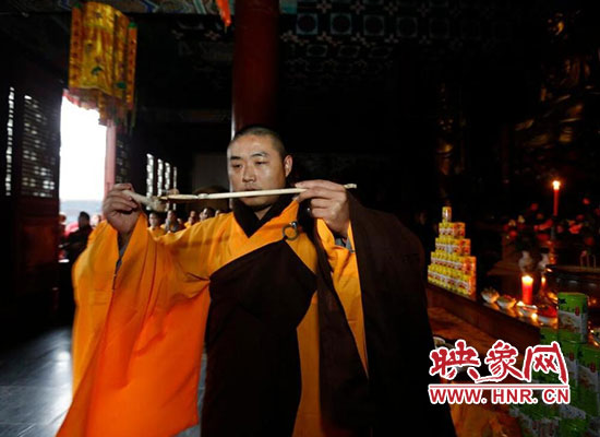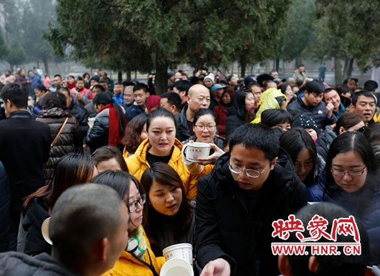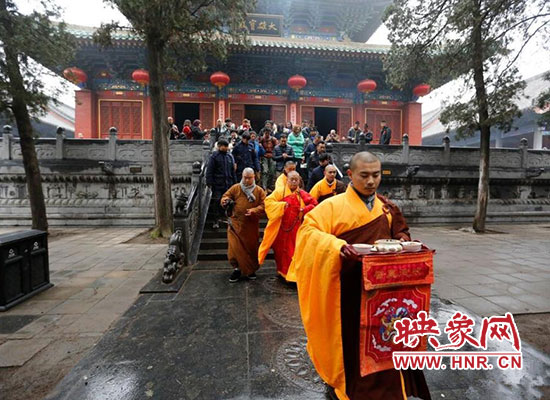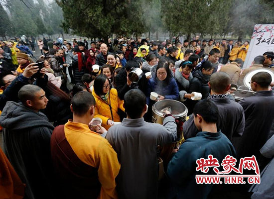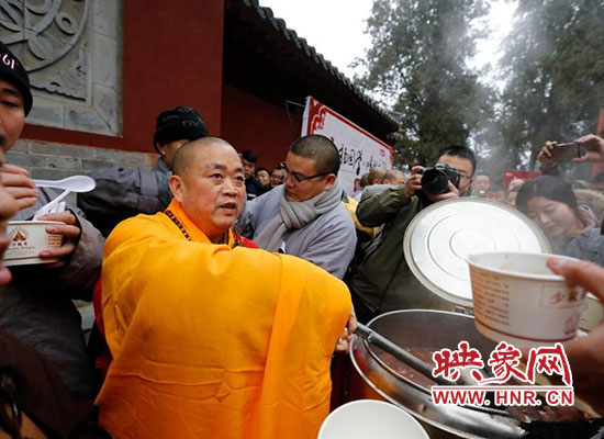 2017年1月5日在河南省登封少林寺,少林寺臘八施粥并舉行祈福法會,吸引數(shù)千名群眾前來喝粥。昨天是傳統(tǒng)的“臘八節(jié)”,隨著這一天的到來,年味漸濃,整個舊歷年年俗隨之拉開帷幕。