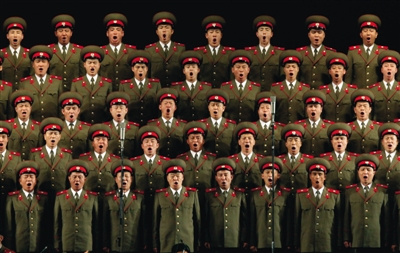 25日,平壤四二五文化會(huì)館,朝鮮軍人正在高歌慶祝建軍80周年,當(dāng)天朝鮮黨政軍主要領(lǐng)導(dǎo)人參與報(bào)告會(huì)。