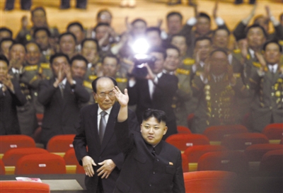 25日,金正恩(前)和委員長(zhǎng)金永南(后)出席報(bào)告會(huì)。