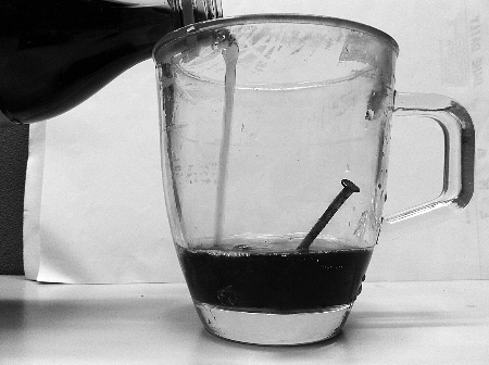 昨天中午12點(diǎn),記者針對(duì)微博上熱炒的“可樂去銹”事件,買來某品牌500毫升可樂一瓶,隨后將兩枚4厘米長(zhǎng)銹跡斑斑的鐵釘放入透明的6厘米高的玻璃杯子里,開始做浸泡實(shí)驗(yàn)。