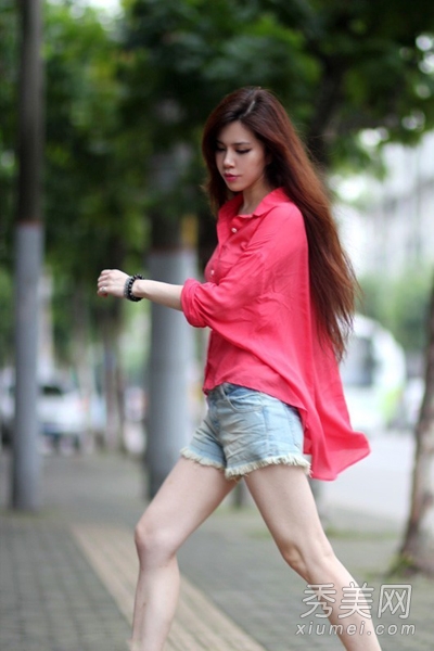 西瓜紅寬松襯衫,前短后長,寬松版型,盡顯歐美風(fēng)范兒。搭配牛仔短褲,清新迷人,大秀美腿,特別清爽有型哦。