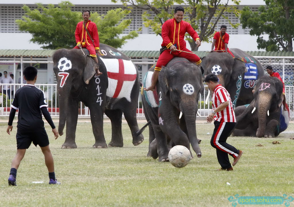 6月9日,學生們與身上畫有世界杯參賽球隊國旗圖案的大象踢足球。 當日,在泰國大城府舉行了一場有大象參與的“世界杯”足球比賽。 新華社/路透