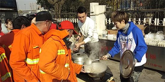 另一邊,在鄭州市花園路廣電南路交叉口,主持人劉雯和韓佳帶著十幾名義工早早的在路邊就開始忙活了。他們要給附近50多名環(huán)衛(wèi)工人煮餃子。平時(shí),環(huán)衛(wèi)工們的午飯都很簡單,甚至都是隨便對付的,這次,主持人和義工們特意選在離工人們中午休息比較近的地方,搭起了臨時(shí)的灶臺(tái),給工人們做上一頓熱騰騰的餃子。由于條件簡陋,臨時(shí)灶臺(tái)上的火十分不穩(wěn)定,劉雯和韓佳脫下厚重的外套,擼起袖子親自生火,費(fèi)了好大勁終于把餃子下鍋了。吃上熱騰騰的餃子,環(huán)衛(wèi)工人們特別開心。一位老大爺由衷的感嘆道:“好久沒吃過這么暖心的午飯了,謝謝你們。”