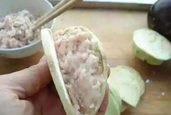 4. 把肉末填入茄盒中。
