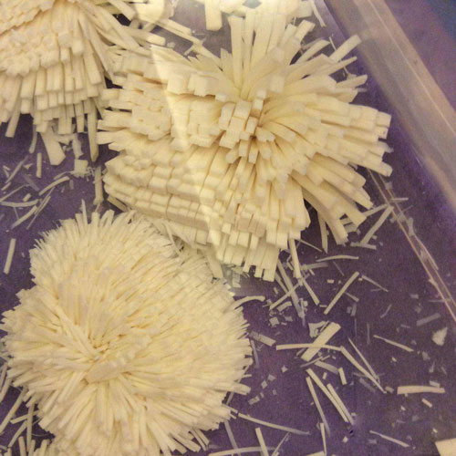 2、將豆腐切成菊花的形狀,然后將切好的豆腐菊花放入盛器。