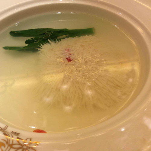 3、鍋置于火上,放入清雞湯燒熱,慢慢的將清雞湯盛入放有菊花豆腐的盛器中。