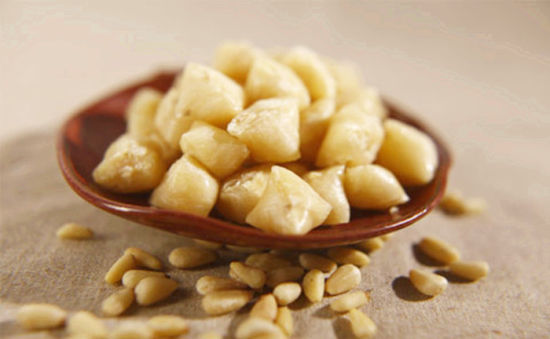 做法:先將白砂糖放入鍋中加少許水,用文火煎熬至粘稠,再加入松子仁,調(diào)勻。然后繼續(xù)煎熬,直至用鏟子挑起成絲狀,不粘手時(shí),?;?,將糖倒在涂有食用油的盤中,待稍涼,將糖切成小塊,即可食用。