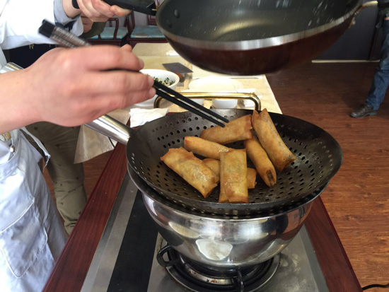 去皮五花肉剁成帶有顆粒感的肉餡,調(diào)好味道,炒熟、晾涼就可以用了。炒餡的時候師傅還用到了具有濃郁開封特色的調(diào)味料,肉餡炒好后韭菜的加入也是頗為講究的,最后像疊被子一樣將春卷包好,下鍋炸成金黃色就可以了!你看,這酥脆的外皮很誘人對不對!