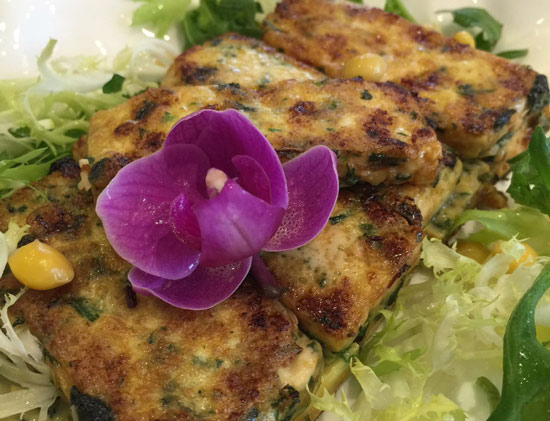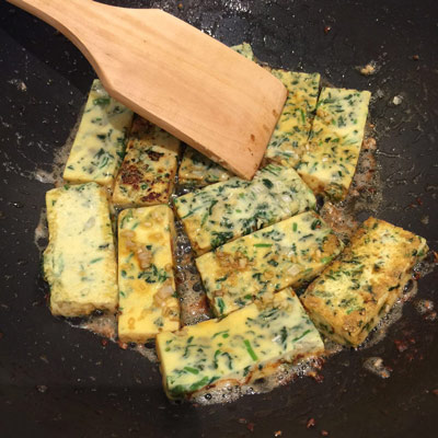 六、煎野菜豆腐。鍋中加入少許油,熱鍋涼油放入豆腐,小火煎制。只要豆腐開始起皮,即可放入少許生抽調(diào)味,再放入蔥姜末炒香。