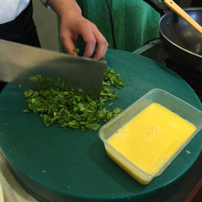 二、在打散的蛋液中加入同比例的豆?jié){,再把切好的薺菜放入,一同攪拌均勻。
