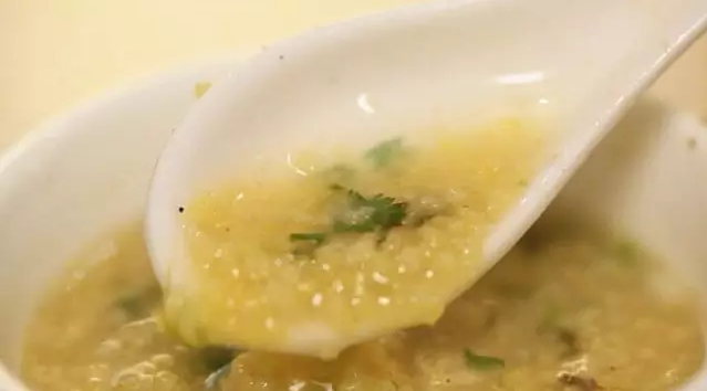 肉快吃完時將嫩黃的小米倒入湯里